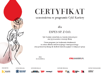 Uczymy się, jak łączyć rozwój zawodowy z troską o człowieka, jego dobrostan i poczucie sensu. W ESPES wierzymy, że tylko tak rozumiany zrównoważony rozwój ma trwałą wartość – bo zaczyna się od ludzi, którzy tworzą firmę każdego dnia.