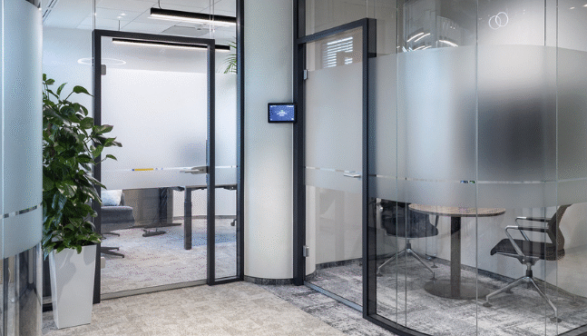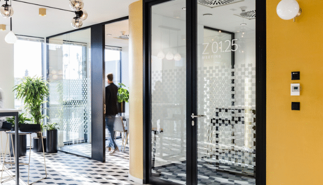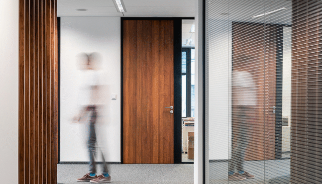 Drzwi w ramie aluminiowej HR to rozwiązanie szyte na miarę, pozwalające na nieograniczoną możliwość konfiguracji z systemami ścian szklanych ESPES. Idealne do wnętrz wymagających większego poziomu izolacyjności akustycznej – zapewnią prywatność i komfort rozmowom w gabinecie czy w sali konferencyjnej