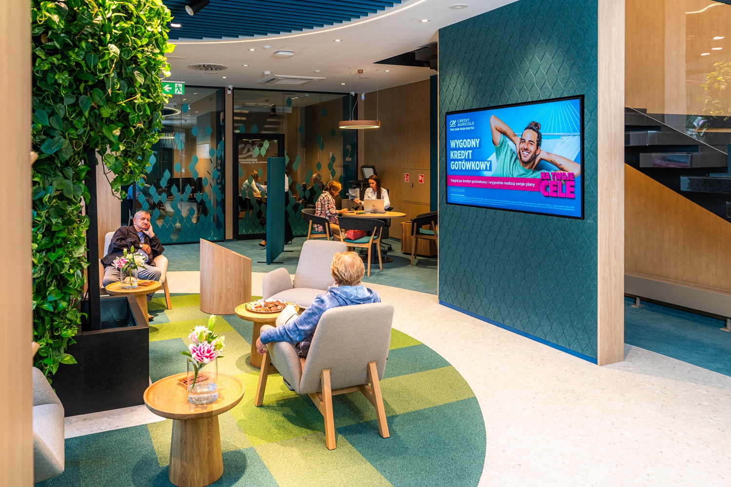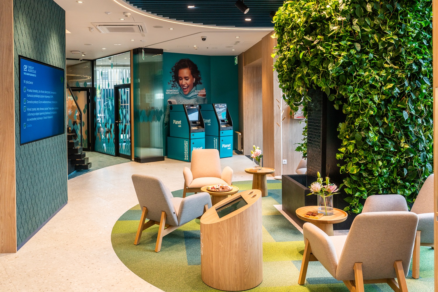 Nowe Centrum Doradcze Credit Agricole to miejsce zaprojektowane w duchu zrównoważonego rozwoju – z ogrodem wertykalnym, kaskadą wodną i technologiami wspierającymi dostępność dla wszystkich użytkowników.